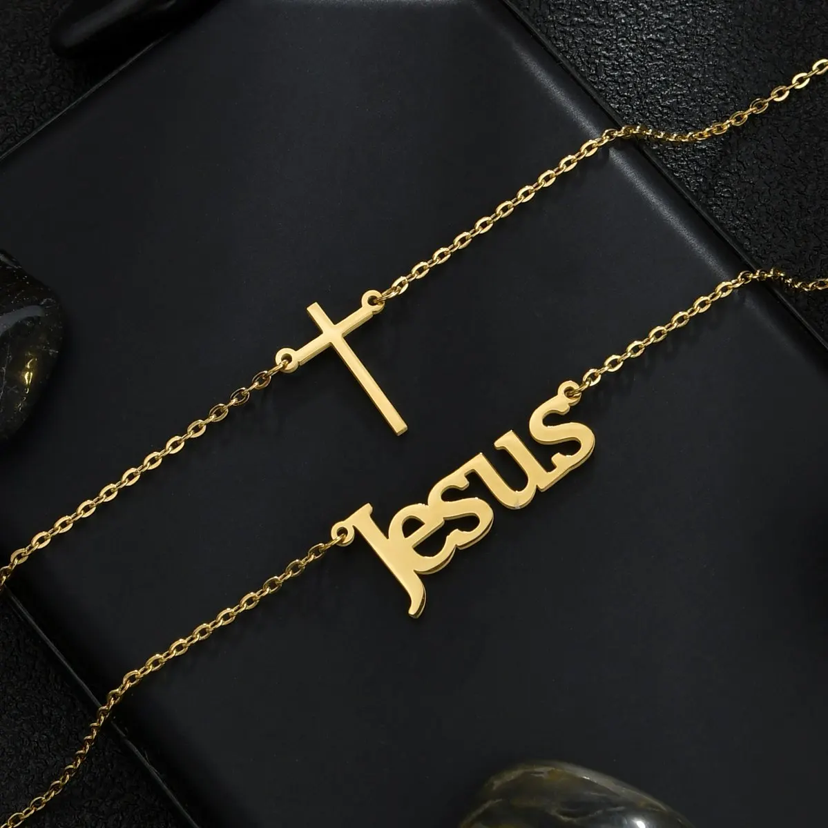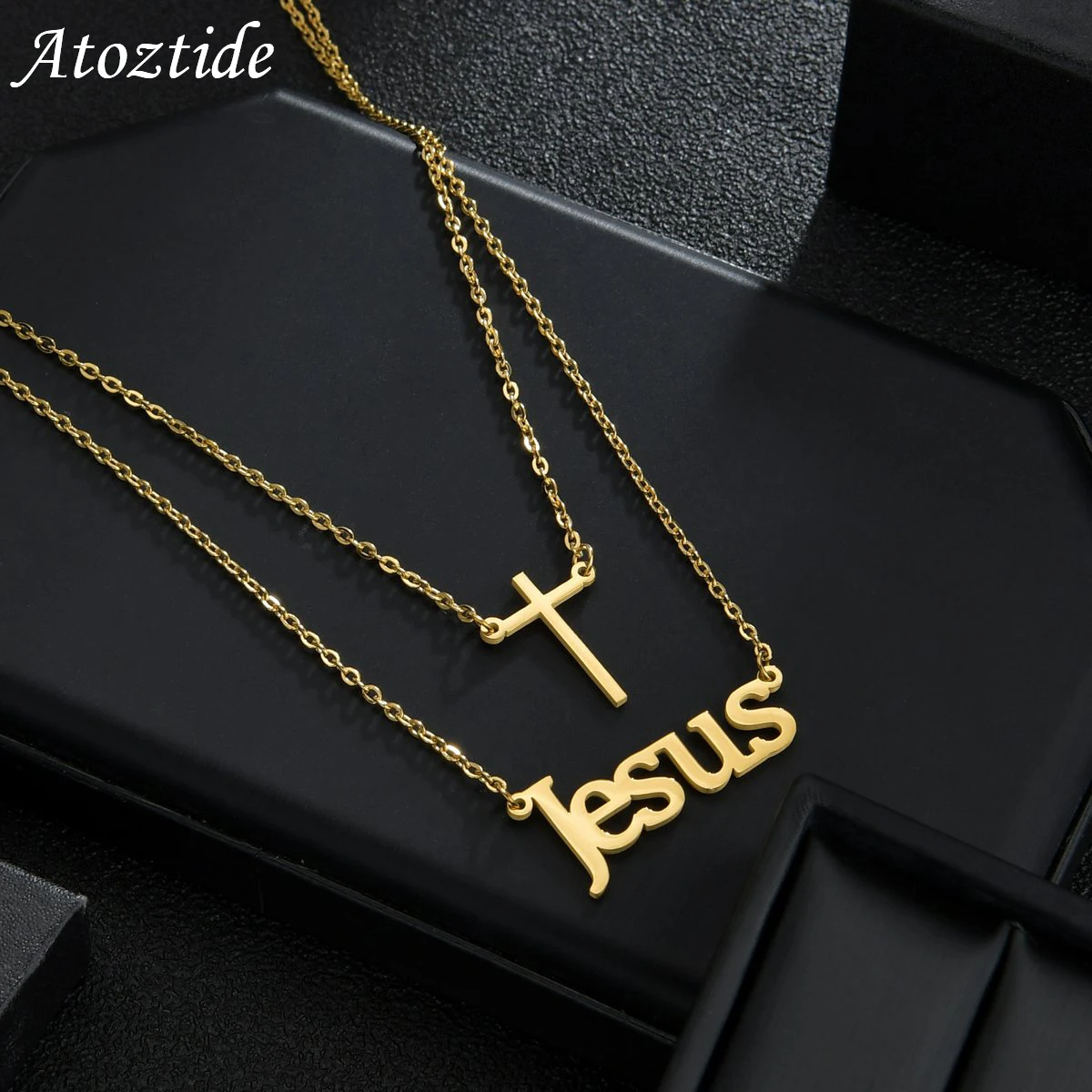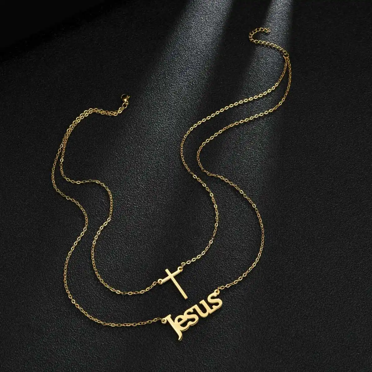 Name:Atoztide Customized Letter Cross Necklace Choker Stainless Steel Personalized Letter Gold Color Double Layers Name Pendant Jewelry for Women Gift